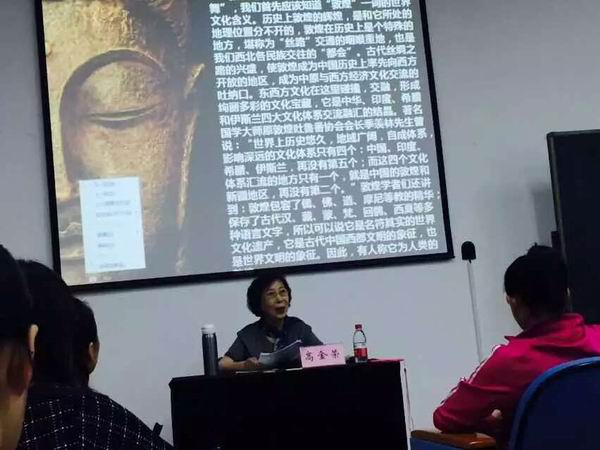 报告会上,高老师从自己的演出实践中总结经验,向学员们生动形象的阐述了敦煌舞的世界文化内涵,从而展示其对乐舞艺术的重要意义。她提出敦煌舞具有佛教色彩、西域风格、唐风唐韵的包容性特点,充满着和谐、宁静、传神、抒情的美。认识敦煌壁画舞姿要从史料中找到它们的发展演变,从发展演变中研究它们的内在联系;要学会依据壁画舞姿特点,参照有关舞蹈史料总结敦煌舞姿的外部特征,从神情气质、舞姿的具体动作和乐舞形式确立其风格和审美。