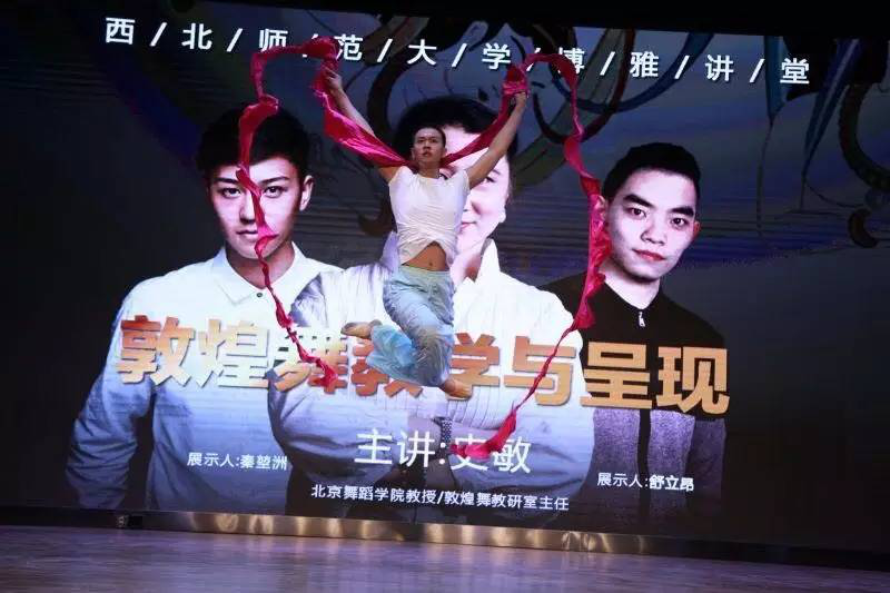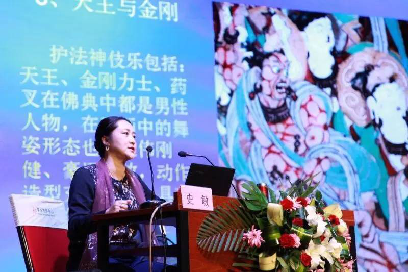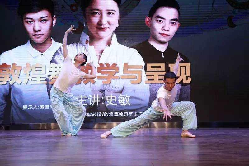 敦煌舞不仅具有深厚的艺术文化底蕴,还具有极高的考古价值,其舞姿象征着敦煌舞独特的艺术风格,还蕴含着深刻的文化涵义。在报告中,史敏教授结合了个人的人生经验漫谈了敦煌舞对于自己的意义和影响,并由此切入到本次学术报告的主题,显得尤为生动。她从五个板块谈了敦煌舞的教学与呈现:1、概述敦煌舞;2、敦煌莫高窟乐舞形象;3、动态呈现敦煌舞内容介绍;4、敦煌舞的审美情趣;5、结语。其中第三版块由史敏教授的两位员工担任演员,他们精彩的男子敦煌舞展示,完美地呈现了史敏教授对男子敦煌舞现阶段的研究成果。