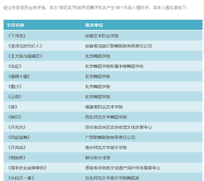 中国舞蹈“荷花奖”是由中宣部批准立项,由中国文联、中国舞蹈家协会主办,全国性舞蹈艺术专业奖项.经过专家委员会评选,本次“荷花奖”民族民间舞评奖共产生48个作品入围终评。