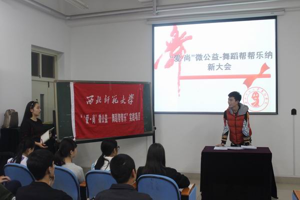 在大会上“舞蹈帮帮乐”各部部长向大家做了自我介绍和部室简介,希望大家都可以根据自己的喜好选择部室;帮帮乐的主旨是希望同学们可以去帮助那些需要帮助的孩子们。让他们体味到童年的快乐与美好。因为只要人人都献出一点爱,这个世界就会变得美好。