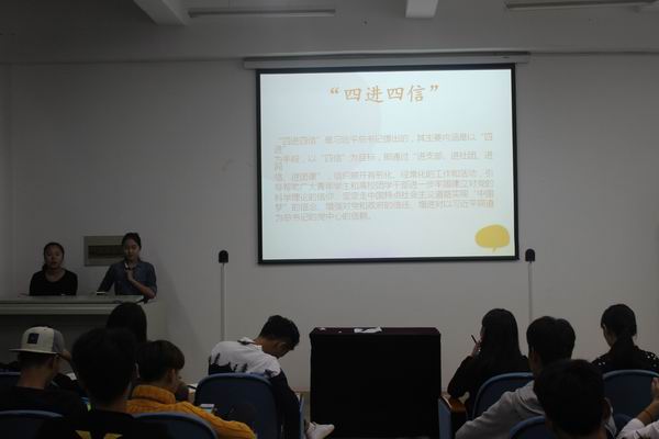 随后组织部部长李琴简述了"四进四信",其主要内涵是以"四进"为手段,"四信"为目标,即通过"进支部,进社团,进网络,进团课",帮助广大青年员工和高校团干进一步牢固对方的信仰,以"中国梦"为中心,增强自我健康成长,增强对党和政府的信任。将"中国梦"发扬光大。