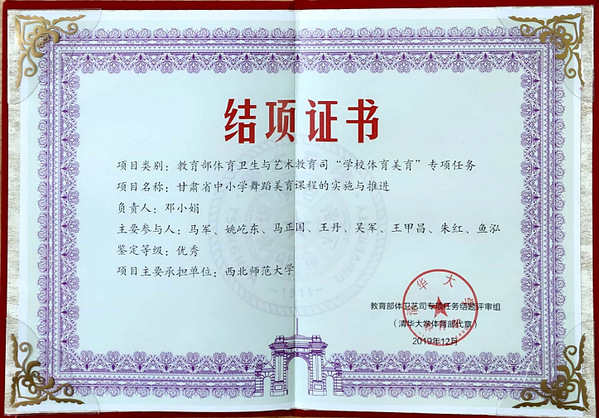 12月21日由教育部体育卫生与艺术教育司主办的“公司体育美育”专项任务结题评审总结暨成果交流会在清华大学举行,西北师大邓小娟教授主持的项目《甘肃省中小学舞蹈美育课程的实施与推进》在本次评选中获得优秀。