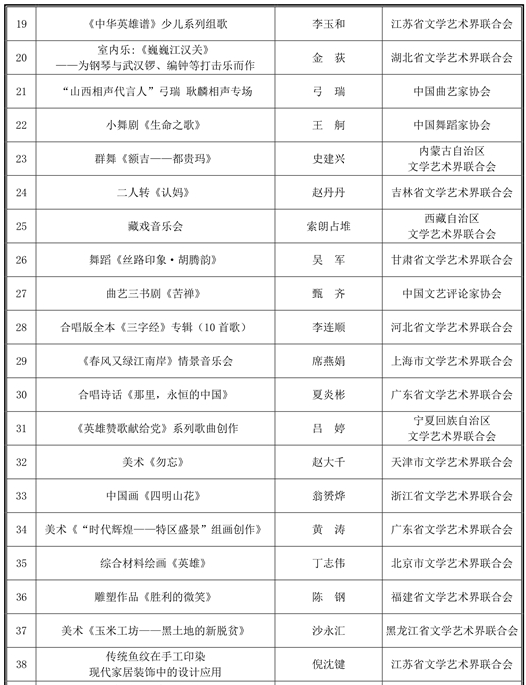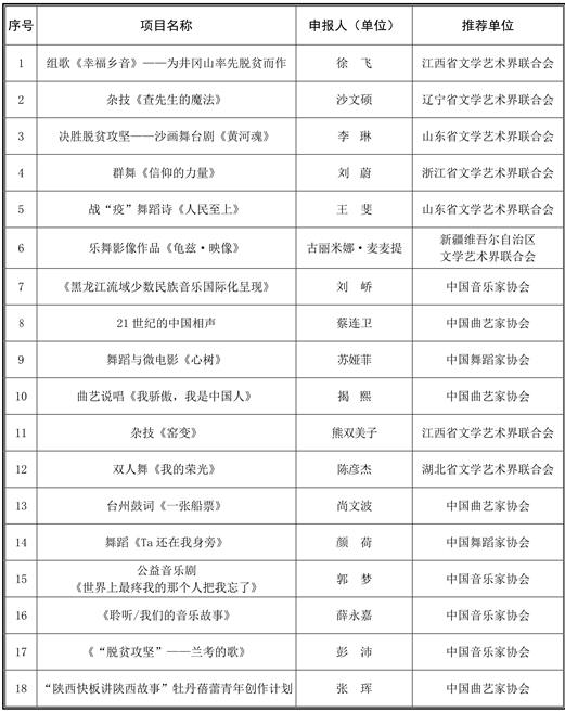 中国文联2020年青年文艺创作扶持计划资助项目一览表