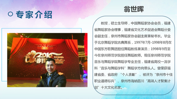 翁世晖教授,硕士生导师,中国舞蹈家协会会员,福建省舞蹈家协会理事,福建省文化艺术促进会舞蹈分委会副主任,泉州市舞蹈家协会副主席兼秘书长。