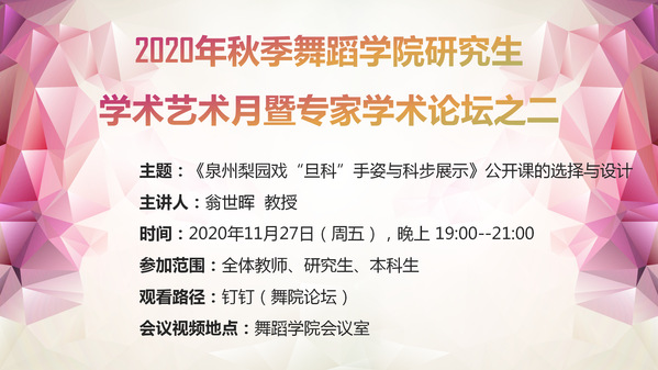 2020年秋季js33333金沙线路检测研究生学术艺术月暨专家学术论坛二于11月27日(周五)晚19:00——21:00在js33333金沙线路检测会议室举行线上授课,观看软件是钉钉(舞院论坛)。本次主题为《泉州梨园戏“旦科”手姿与科步展示》公开课的选择与设计,主讲人为翁世晖教授。