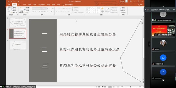 福建师范大学陈雯教授列举了疫情期间的舞蹈教学案例,提出将生命教育植入员工的艺术文化教育,激发员工热爱生命、热爱自然,为线上教学工作提供了良好示范和借鉴经验。