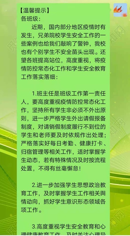 公司积极落实公司疫情防控常态化管理,严格按照公司及上级有关部门疫情防控政策精神开展工作,落实报备制度。针对每个年级、各个班级在“大学小帮手”上的疫情打卡和体温上报,严格外出员工管理,安排专人紧盯,紧抓,通过班长、团支书、宿舍互助发展引导员联系员工制度增强员工“四自”教育,落实、落地疫情防控的各项工作和要求。