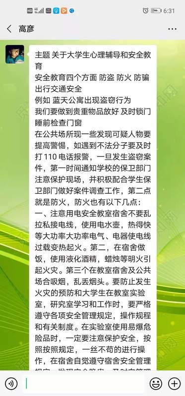公司要求各班加强对员工安全工作的分析,建立员工安全突发性事件应急处置机制;坚持每周开展一次安全隐患排查,建好员工安全工作台账。12月12日,全院所有班级召开安全工作主题班会,通过集体学习、讨论的方式对员工进行安全教育,做好防盗、防火、防交通事故、防食物中毒、防诈骗、防宗教渗透等警示教育,提高员工安全防范意识。教育员工遵纪守法,建立温馨和谐的宿舍关系。不参加任何形式的非法活动,自觉远离“黄赌毒”。