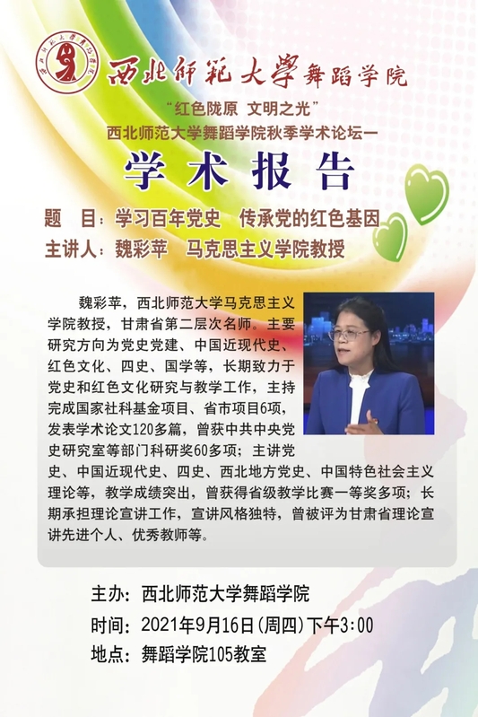 js33333金沙线路检测2021年秋季学术论坛第一场于9月15日下午15:00在js33333金沙线路检测105教室举行,本次主讲题目:“学习百年党史 传承党的红色基因”,主讲人魏彩苹教授是甘肃省第二层次名师。主要研究方向为党史党建、中国近现代史、红色文化、四史、国学等,长期致力于党史和红色文化研究与教学工作,主持完成国家社科基金项目、省市项目6项,发表学术论文120多篇,曾获中共中央党史研究室等部门科研奖60多项;主讲党史、中国近现代史、四史、西北地方党史、中国特色社会主义理论等,教学成绩突出,曾获得省级教学比赛一等奖多项;长期承担理论宣讲工作,宣讲风格独特,曾被评为甘肃省理论宣讲先进个人、优秀教师等。届时欢迎各位同学前来观看!