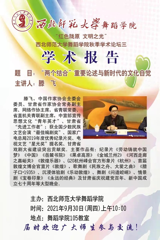 本次主讲题目:“两个结合”重要论述与新时代的文化自觉。主讲人:腾飞是中国作家协会全委会委员、甘肃省作家协会常务副主席、网络作协主席,省青联常委、省直机关青联副主席,中宣部宣传思想文化“青年英才”、甘肃省“先进工作者”;获全国少数民族文艺会演“最佳编剧奖”、国家广电总局2019年度优秀纪录片奖、电视文艺“星光奖”提名奖、甘肃省戏剧大省建设突出贡献奖。主要作品有:纪录片《劳动铸就中国梦》《中国》《岳麓书院》《果卓高原》《金城兰州2》《河西走廊之嘉峪关》《敦煌乐器》、G20杭州峰会官方形象片《杭州》、首届敦煌文博会官宣片《敦煌》,歌舞剧《民族之舟、大爱之曲》《腊子口·1935》、沉浸体验剧《乐动敦煌》、舞剧《问道崆峒》、情景剧《宝卷印象》《永远的经典》及甘肃省庆祝建党百年、新中国成立七十周年等大型晚会。
