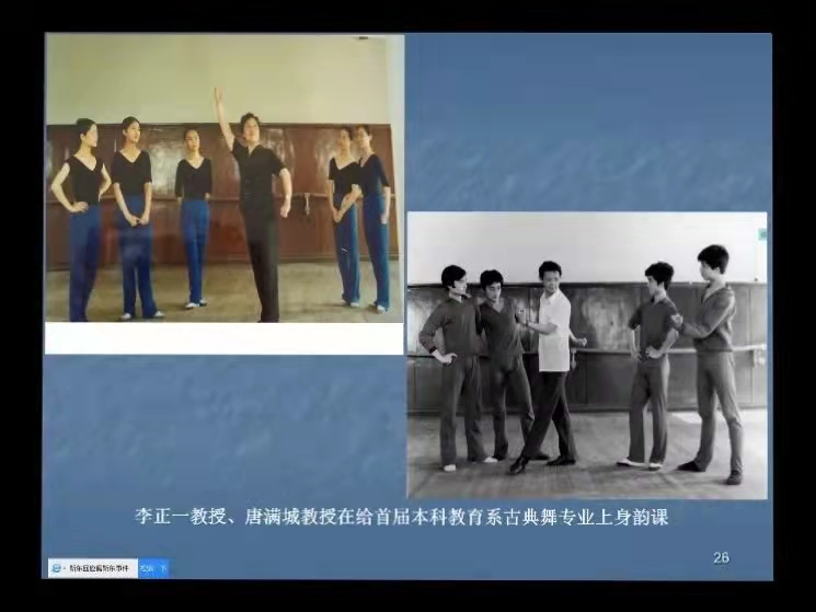 其次,金教授分析了男女班古典舞基训的不同,以及当时对男班基训课的改革。随后,对汉唐古典舞学派的发展进行讲解,尊奉孙颖的学术观点为指导,以构建汉唐古典舞学派的教学任务为原则,把汉唐古典舞作为训练教材。尤其是2009年复排舞剧《铜雀伎》的公演,基本上体现了孙颖教授一生所追寻的艺术理想。