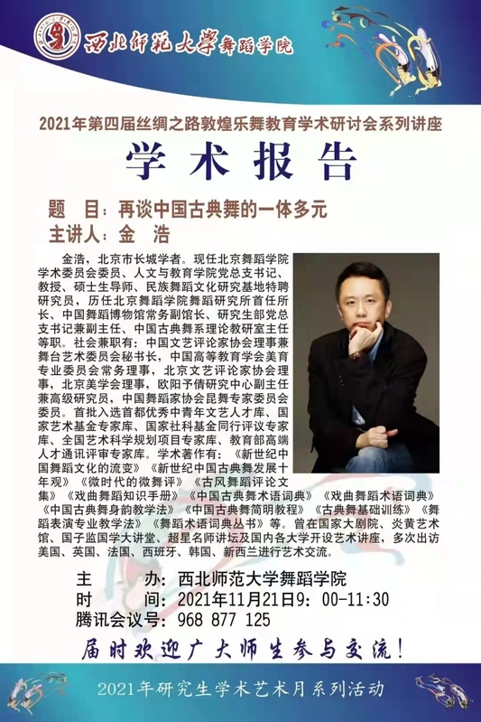 js33333金沙线路检测秋季第七场学术报告,2021年第四届丝绸之路敦煌乐舞教育学术研讨会系列讲座暨2021年研究生学术艺术月系列活动于11月21日(周日)上午9:00—11:30在线上(腾讯会议APP)举行。