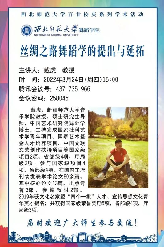 本次主讲题目:《丝绸之路舞蹈学的提出与延拓》主讲人:戴虎教授,新疆师范大学音乐公司教授、硕士研究生导师、中国艺术研究院舞蹈学博士。主持完成国家社科艺术学青年项目、国家艺术基金人才培养项目、中国文联文艺创作扶持项目等国家级项目2项,省部级4项、厅局级2项。参与国家级项目4项,省部级4项。在国内主流刊物发表学术论文50余篇,其中核心论文13篇,出版专著3部,参编教材2部。2019年获文化名家暨“四个一批”人才、宣传思想文化青年英才提名;共获得国家级荣誉奖励5项,省部级4项,厅局级3项。