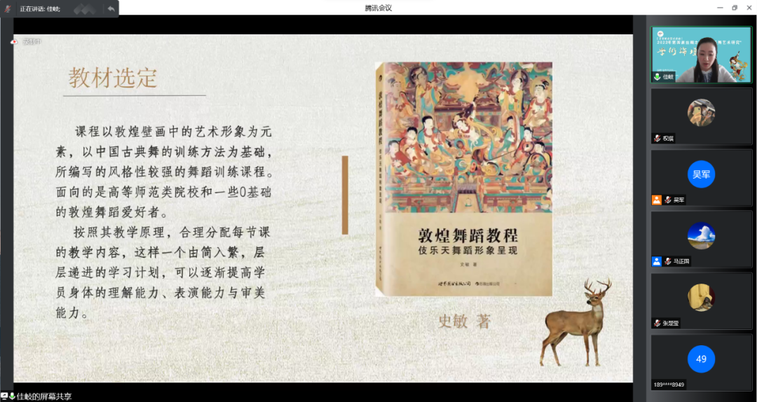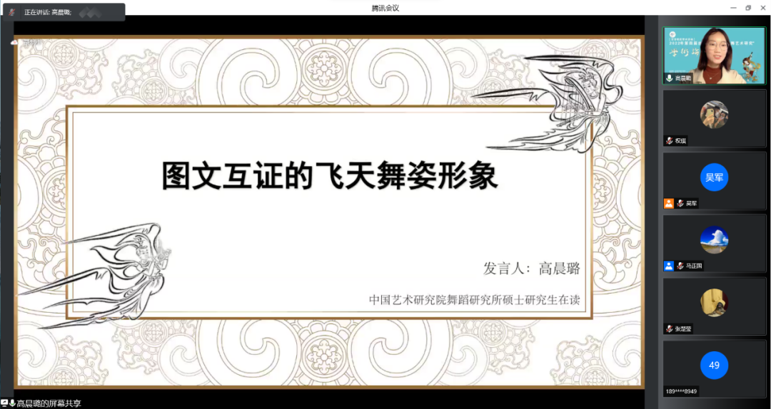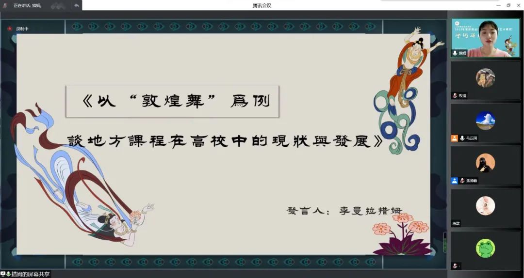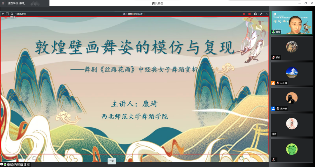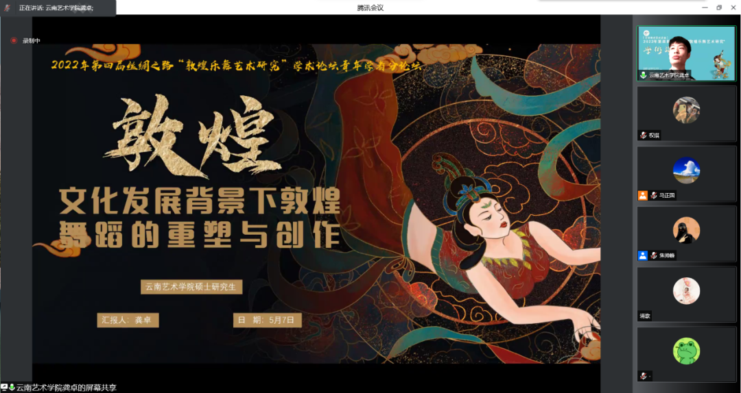 2022年第四届丝绸之路“敦煌乐舞艺术研究”学术论坛青年论坛下半场在腾讯会议上继续举行。通过两天三场的精彩讲座,有序的完成了35位专家学者主旨发言,以“敦煌舞派”建设为导向,共话新时期敦煌乐舞艺术的发展。