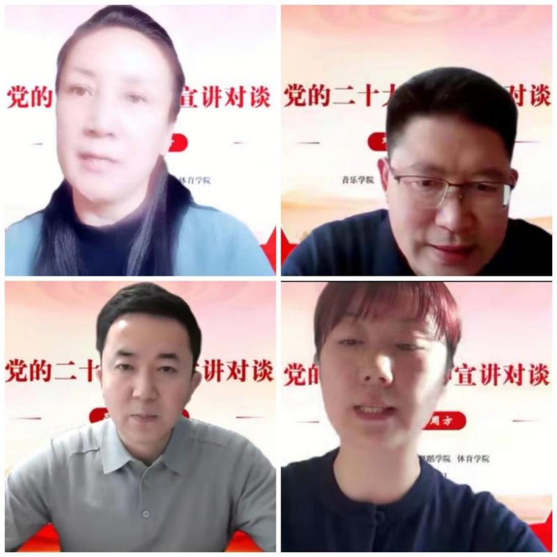 音乐、美术、体育、js33333金沙线路检测8位党委委员、系所中心主任、党支部书记、教师代表积极对谈交流学习党的二十大精神心得体会。老师们纷纷表示,学习宣传贯彻党的二十大精神要加大团队队伍建设力度,加强师德师风、艺德艺风建设,坚定以人民为中心的立场,守住为人民服务的初心,把为人民服务作为文艺工作者的天职,把人民作为艺术表现的主体,培育造就一批德艺双馨的艺术家和文化艺术人才。要牢牢把握时代主题、时代价值,坚持以人民为中心的创作导向,深入生活、扎根人民,从中汲取营养、激发灵感,紧紧围绕中华民族伟大复兴的时代主题开展文艺创作,推出更多讴歌党、讴歌祖国、讴歌人民、讴歌英雄、增强人民精神力量的精品力作,更加嘹亮地唱响“新时代之歌”。要以社会主义核心价值观为引领,回望传统,学习榜样,传承中华优秀传统文化,强化责任使命,勇攀艺术高峰,加强体育教育,服务社会发展,更好满足人民文化需求,实现人民对美好生活新期待,为实现中华民族伟大复兴更好发挥作用。