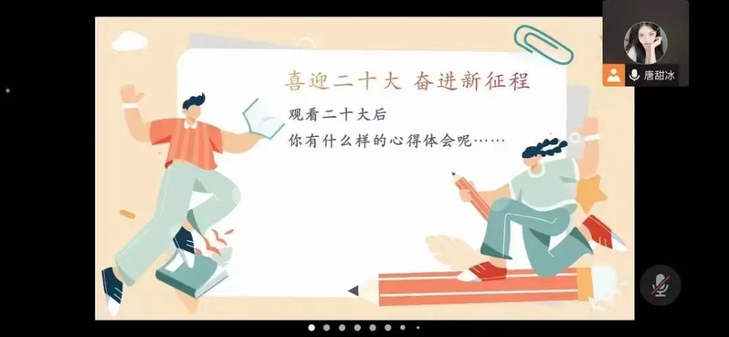 12月27日,公司开展了”学习二十大,永远跟党走,奋进新征程“线上主题宣讲会,公司辅导员从“为什么学、学什么、如何学”三个维度与广大青年团员共同学习二十大精神,引导同学们牢记习近平总书记的嘱托,肩负起“强国一代”的历史重任,回报祖国,号召同学们明确自己的职责,提高政治觉悟和理论修养。