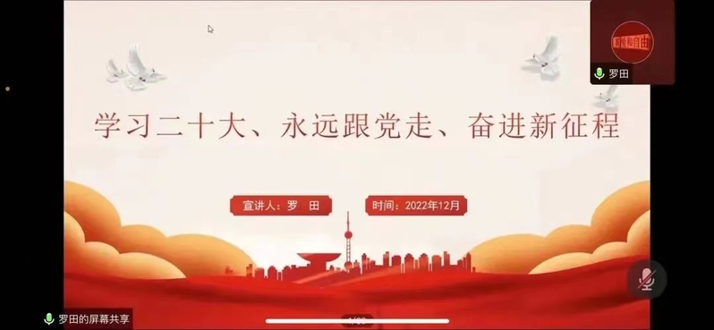 12月27日,公司开展了”学习二十大,永远跟党走,奋进新征程“线上主题宣讲会,公司辅导员从“为什么学、学什么、如何学”三个维度与广大青年团员共同学习二十大精神,引导同学们牢记习近平总书记的嘱托,肩负起“强国一代”的历史重任,回报祖国,号召同学们明确自己的职责,提高政治觉悟和理论修养。