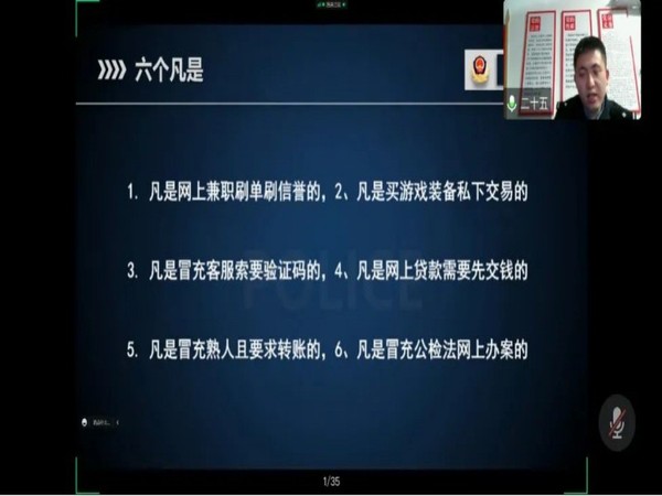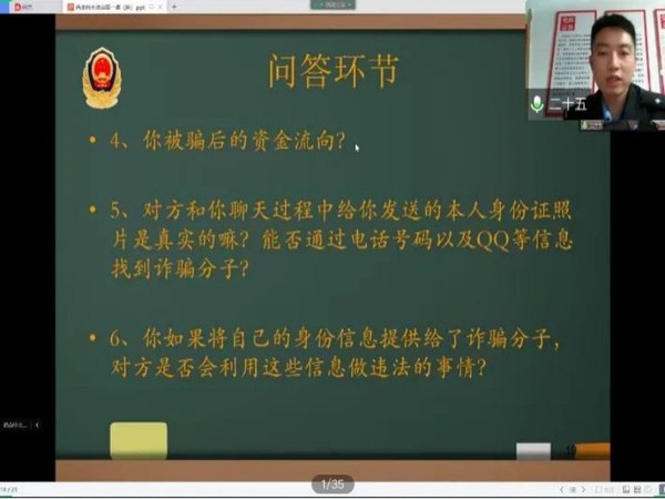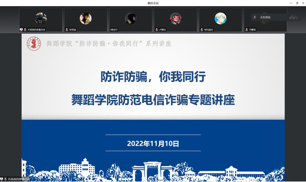 为进一步提升员工识诈防诈能力,增强防范电信网络诈骗意识,11月10日,js33333金沙线路检测邀请兰州市公安局安宁分局培黎派出所警员、西北师大社区社区民警卫世庄和罗中宇在线上举办了“反诈防骗,你我同行”防范电信诈骗专题讲座,帮助同学们树立日常安全反诈意识,维护校园安全与网络文明。