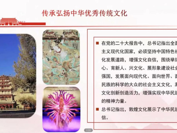 讲座第二部分,康老师结合敦煌艺术对推进文化自信自强、铸就社会主义文化新辉煌展开讲解。针对传承弘扬中华优秀传统文化,习近平总书记指出全面建设社会主义现代化国家,必须坚持中国特色社会主义文化发展道路,增强文化自信,围绕举旗帜、聚民心、育新人、兴文化、展形象建设社会主义文化强国,发展面向现代化、面向世界、面向未来的、民族的、科学的、大众的社会主义文化,激发全民族文化创新创造活力,增强实现中华民族伟大复兴的精神力量。铸就社会主义文化新辉煌要坚持为人民服务、为社会主义服务,坚持百花齐放、百家争鸣,坚持创造性转化、创新性发展,以社会主义核心价值观为引领,发展社会主义先进文化,弘扬革命文化,传承中华优秀传统文化。我们作为中华民族文化与优秀经典当中的一份子,有责任也有义务将它传递下去。