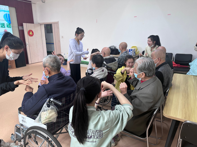 志愿者教老人们手势舞