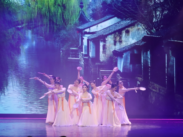 《莲鼓越歌行》源于浙江地域特色“水乡鼓”,围绕着采莲女的生活风情和人物形象,塑造了一幅古代越地女子载歌载舞的动态画卷。