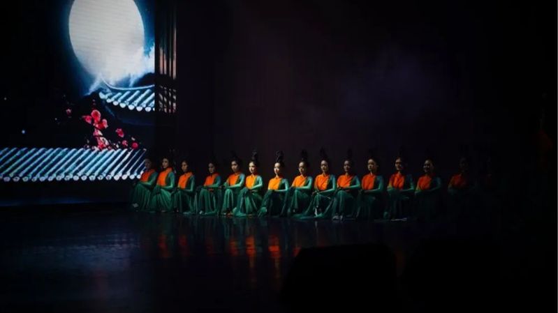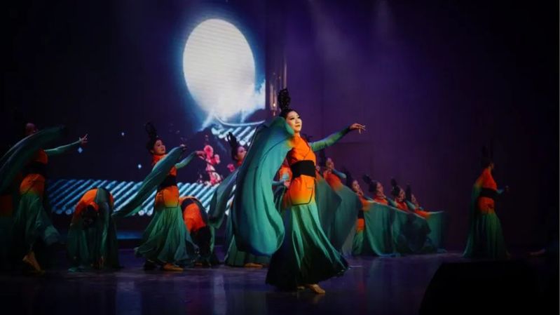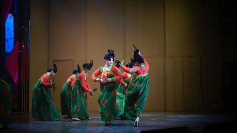 鬓云欲度香腮雪,衣香袂影是盛唐。”群舞《唐宫夜宴》展现出大唐的盛世风韵。该舞蹈作品以创新的手法抹去时间遗留的灰尘,展现出具有历史风韵和魅力的大唐文化。