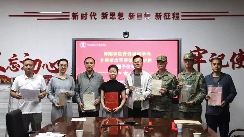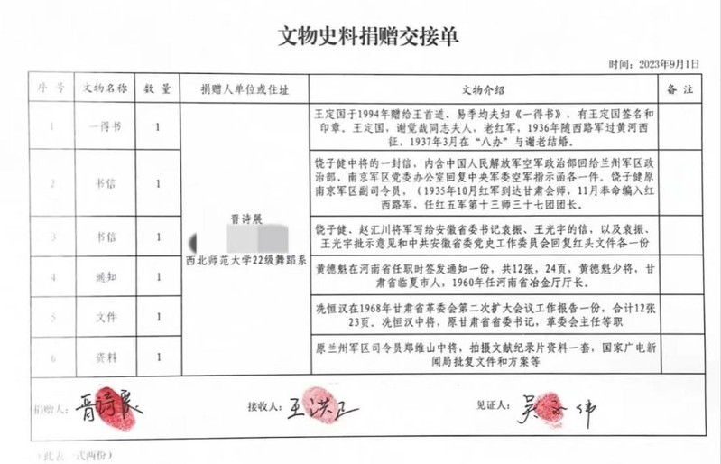 甘肃革命军事馆筹建办文物史料组负责人李永超在致辞中讲到,革命文物承载党的光辉历史、蕴含革命先烈的伟大精神,是构成红色文化的重要内容,晋诗展同学此次捐赠对甘肃省革命文化传承而言意义重大,他代表甘肃革命军事馆接受捐赠并对红色后代对甘肃省革命历史的关心、支持表示衷心的感谢。甘肃省革命军事馆将用心、用情、用力将革命文物保护好、管理好、运用好,切实发挥好革命文物在党史学习教育、革命传统教育及爱国主义教育方面的作用,让红色基因代代相传。