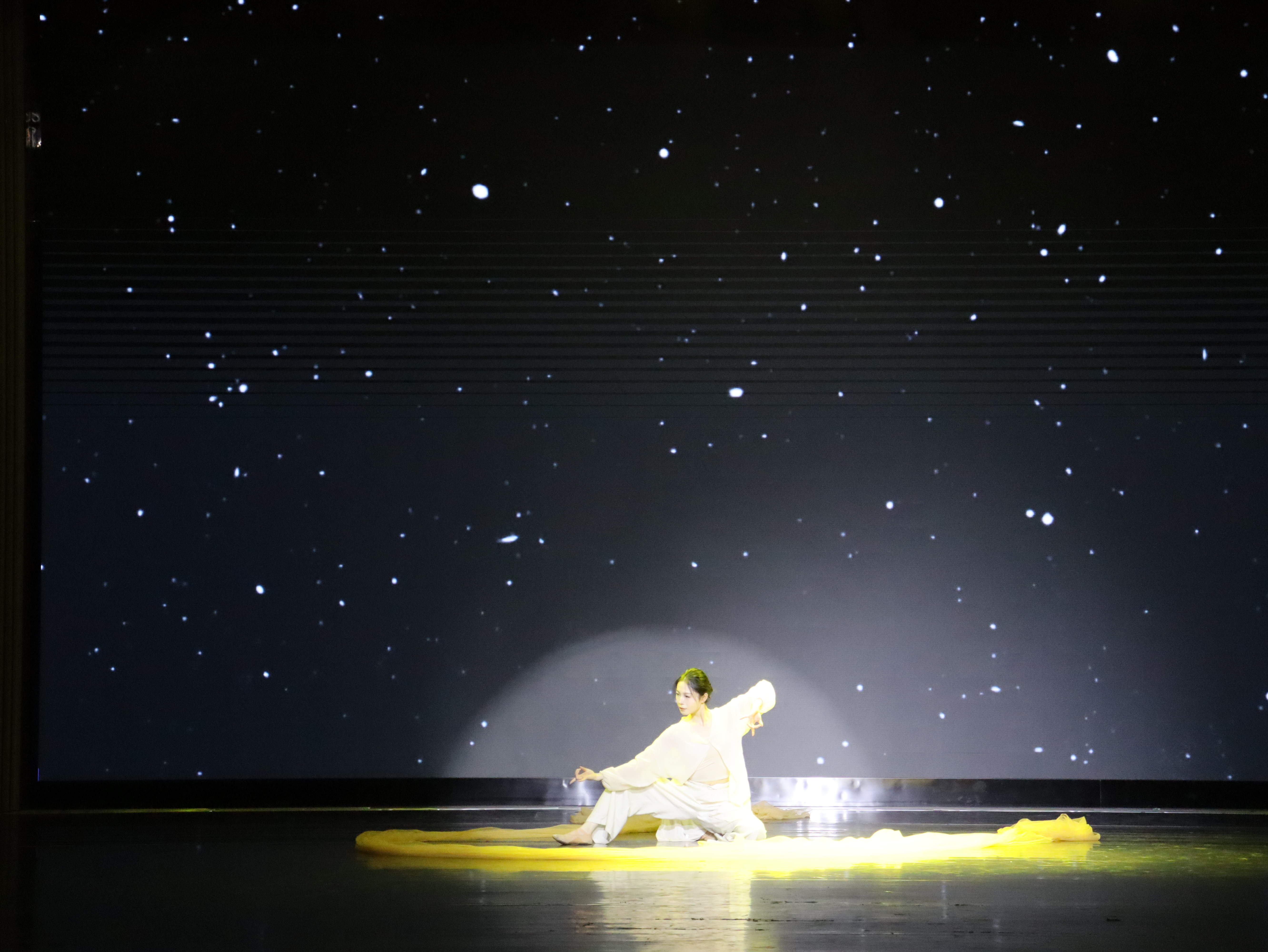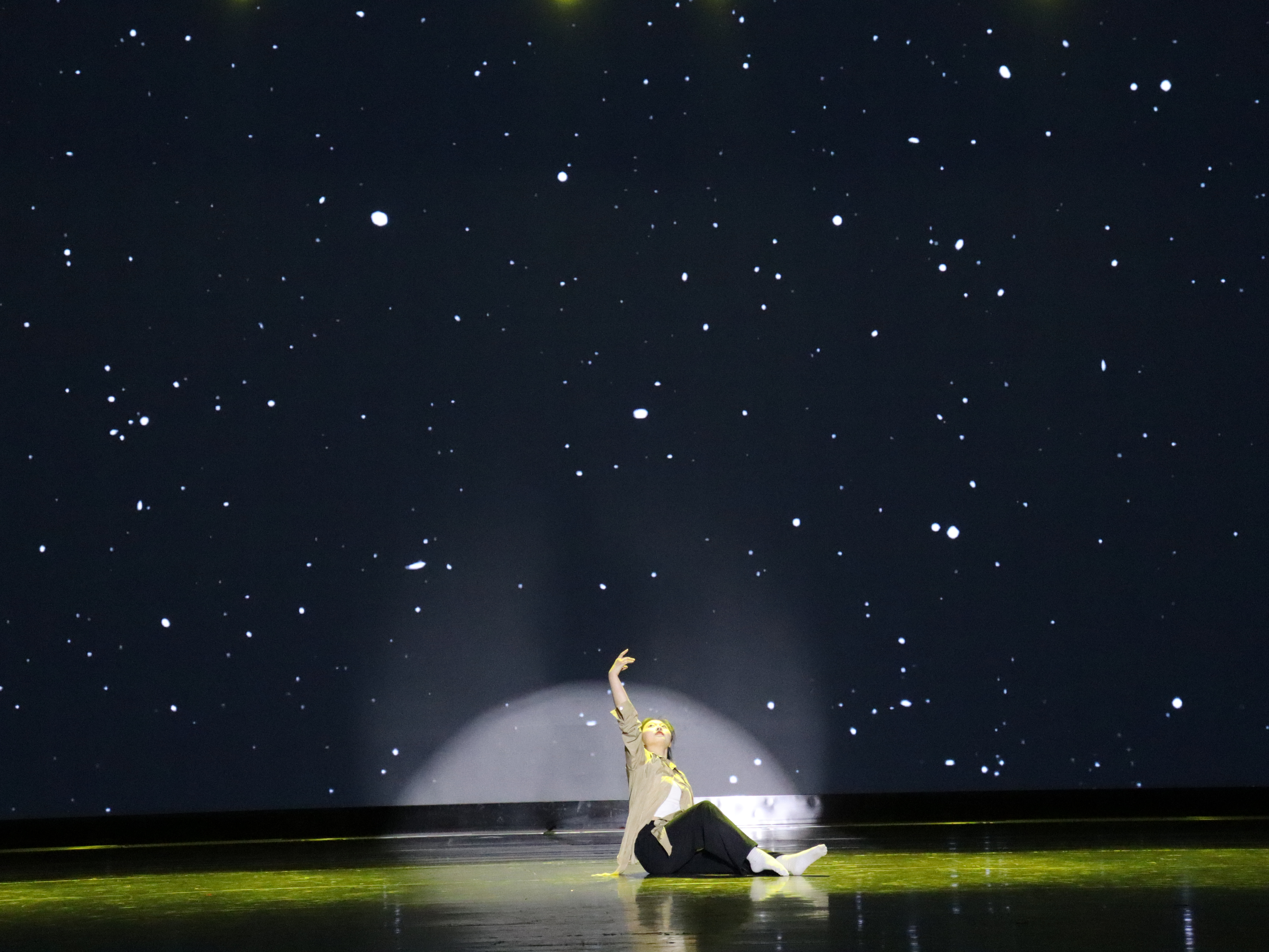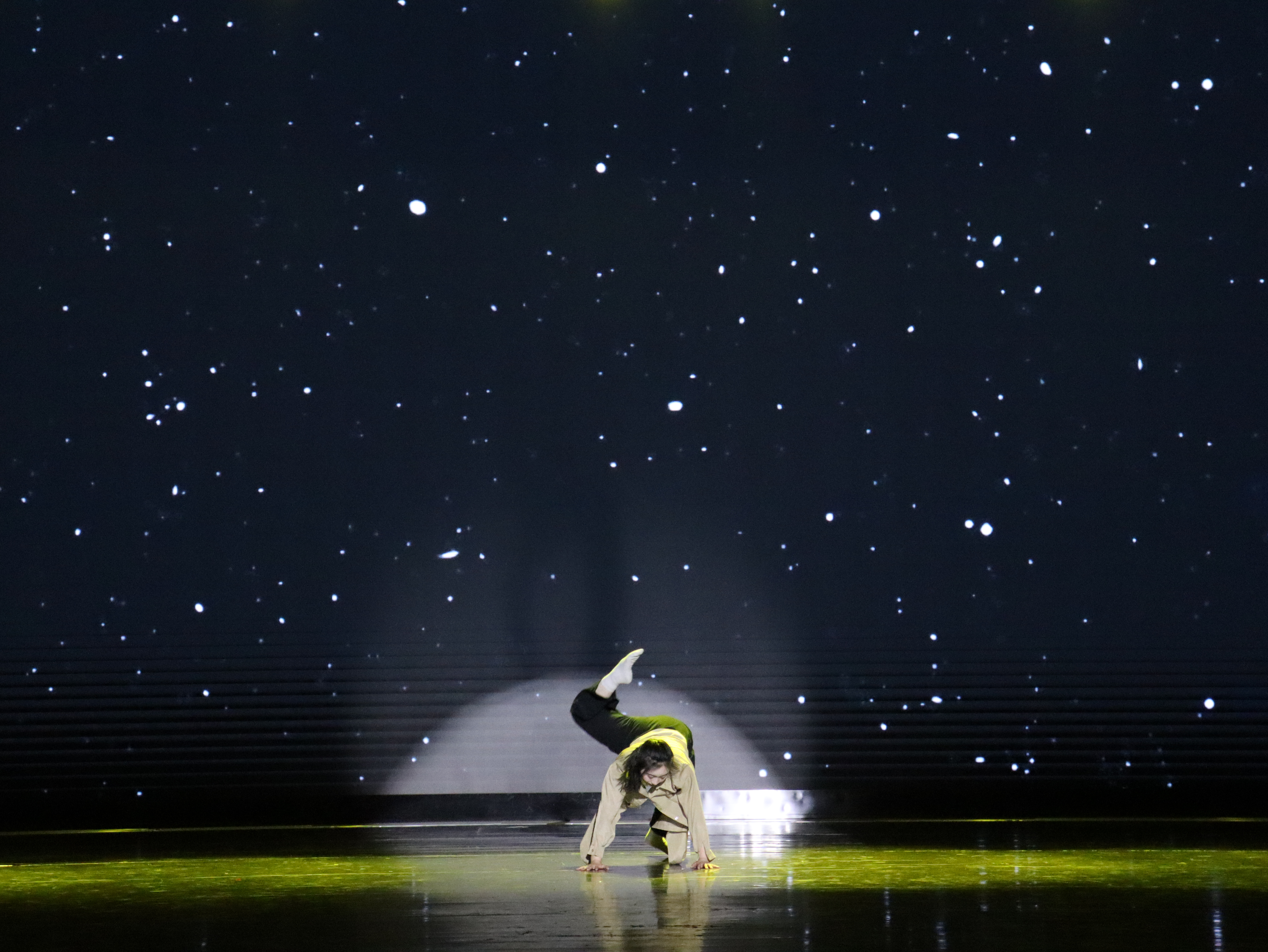 舞蹈《随》。在混沌的天地间,感知来自洪荒的生命涌动,呼唤着在时间沙漏中被遗忘的身体觉知,此刻舞者褪去所有的舞蹈技巧,专注于认识自己的身体,随心而动,随念而舞,任肌肉张驰,任四肢百骸大开大合、蜷曲盘缩,展示出生命的呼唤与因“随”而“和”的力量!