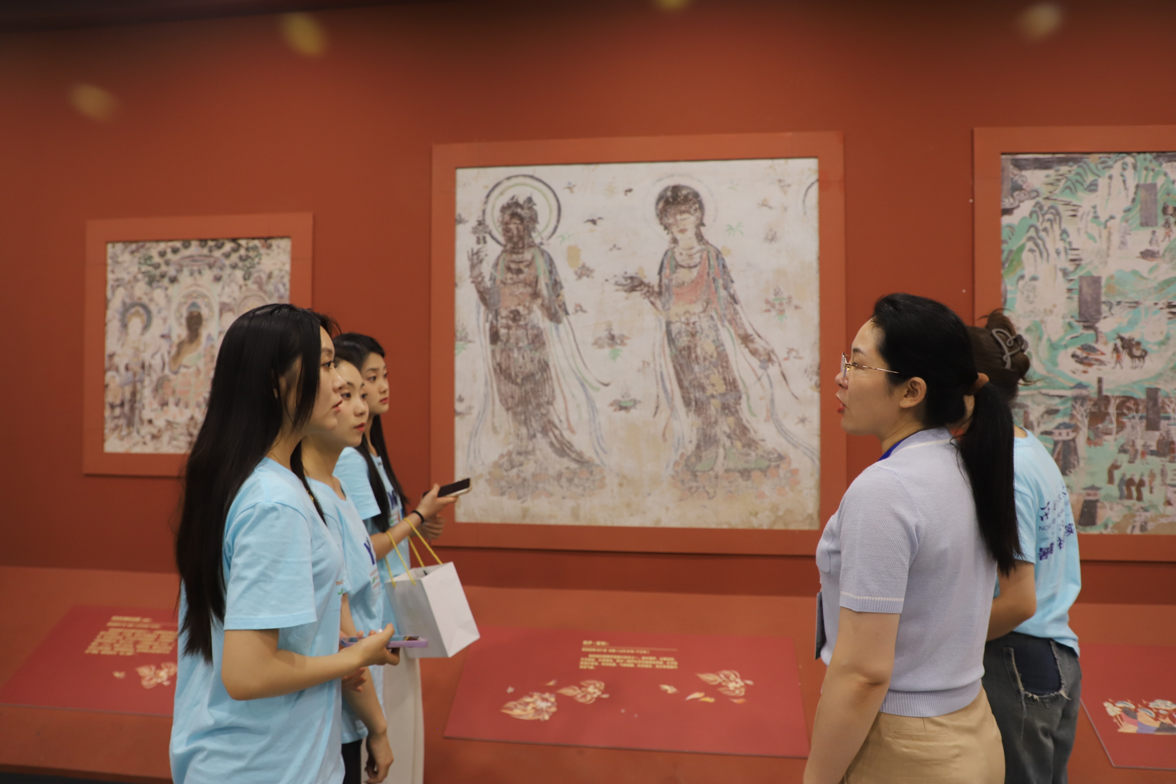 7月17日下午,实践团第四站——敦煌艺术馆。敦煌研究院副研究员祁晓庆,为成员们一一介绍壁画。从经变画、史迹画、故事画,到石窟的结构、特征,石窟守护者……老师的娓娓道来,让同学们身临其境,仿佛看见了飞天、花雨、“打不走的莫高人”……参观完艺术馆后,大家纷纷表示艺术观的学习机会非常宝贵,为其后续的研究学习提供了极大的帮助。