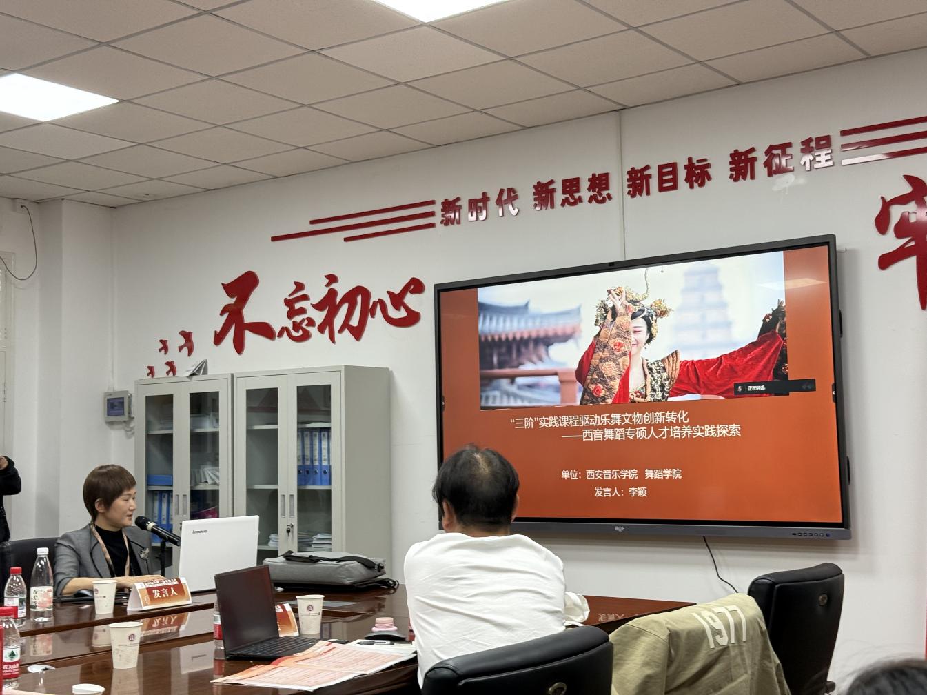 西安音乐公司教务处长李颖教授的发言题目是《“三阶”实践课程驱动乐舞文物创新转化——西音舞蹈专硕探索区域乐舞历史根脉与当代传承》,她以舞蹈专硕“三阶实践课程驱动陕西乐舞文物创新转化”为核心案例,分享“基础考据筑基-应用转化赋能-创新传播拓界”课程体系的构建实践,立足陕西区域乐舞历史根脉探索其当代传承新路径,以此呈现西安音乐公司在乐舞文物活化中的实践与思考。